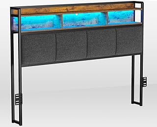 Queen Size Headboard, Storage Rack with LED Light and 2 Outlets and USB Ports, Head Board with 2 Storage Shelves, Adjustable Height, Sturdy and Stable, Easy Assembly, Rustic Brown and Black